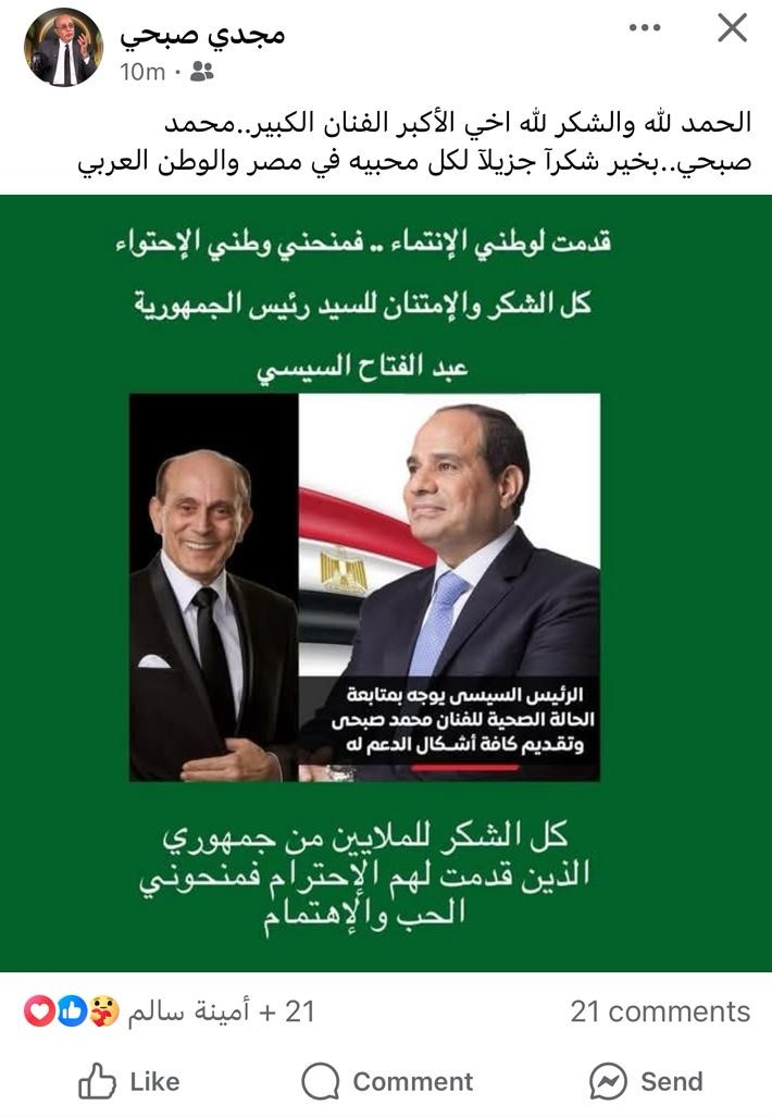 كتب مجدي صبحي في منشوره: «الحمد الله أخي بخير شكرًا لكل محبيه في مصر والوطن العربي.»