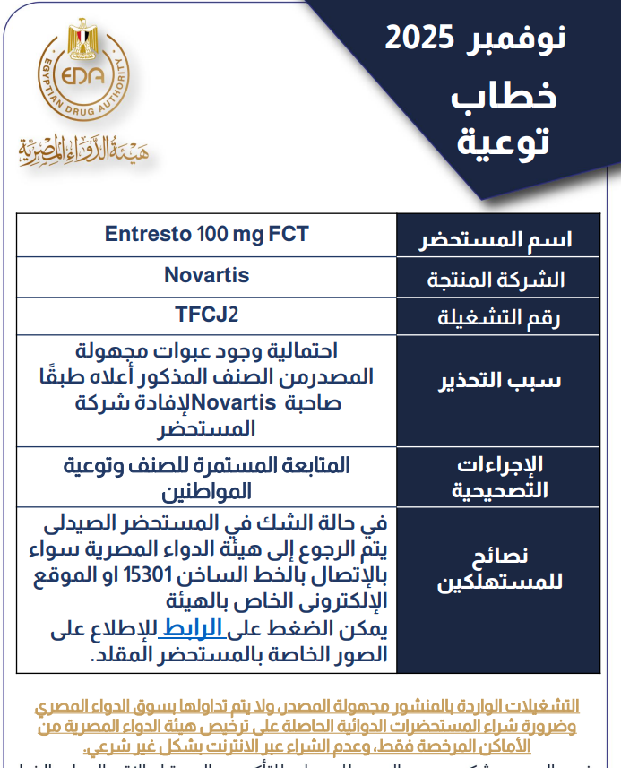 ويأتي هذا في إطار الحرص التام على سلامة المرضى وضمان «فعالية العلاج» المقدم لهم، خاصة وأن دواء «انتريستو» يُستخدم لحالات قصور القلب المزمن، وهي حالات صحية دقيقة تتطلب علاجاً موثوقاً.