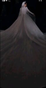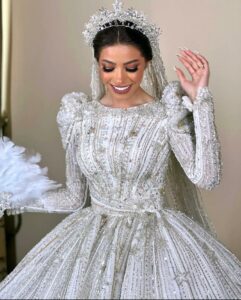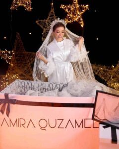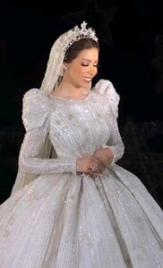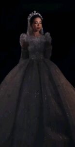 وظهرت بفستان من تصميم مصممة الأزياء أميرة قزامل يتخلله تطريزات ونجوم، ومرصع بالألماظات وفصوص من الكريستالات وطرحة طويلة يصل طولها لأكثر من ثلاثة أمتار وظهرت بتاج من النجوم والكريستالات أبهرت الحضور.