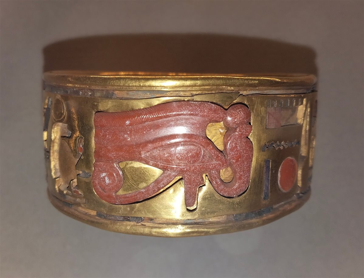 السوار مصنوع من الذهب والعقيق واللازورد والفلسبار، ويزين سطحه الخارجي بعين أوجات من العقيق، التي تعكس أحد ألقاب آمون رع «ملك الآلهة»، أما الشكل المصور أمام العين فيمثل الملك ذاته، في إشارة إلى قوته ومكانته.